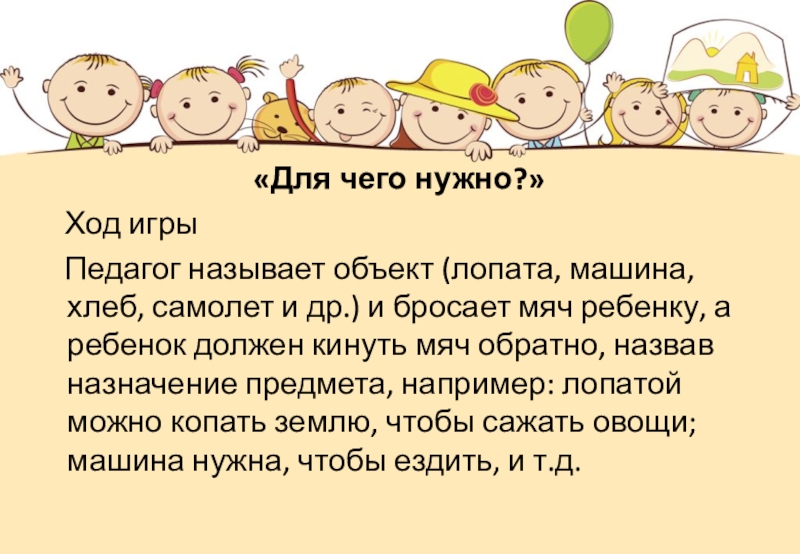 объект (лопата, машина, хлеб, самолет и др.) и бросает мяч ребенку, а ребенок должен кинуть мяч обратно, назвав назначение предмета, например: лопатой можно копать землю, чтобы сажать овощи; машина нужна, чтобы ездить, и т.д.