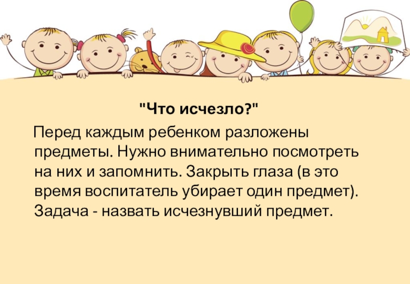 посмотреть на них и запомнить. Закрыть глаза (в это время воспитатель убирает один предмет). Задача - назвать исчезнувший предмет.