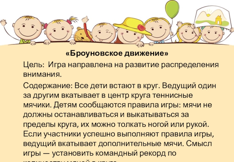 Содержание: Все дети встают в круг. Ведущий один за другим вкатывает в центр круга теннисные мячики. Детям сообщаются правила игры: мячи не должны останавливаться и выкатываться за пределы круга, их можно толкать ногой или рукой. Если участники успешно выполняют правила игры, ведущий вкатывает дополнительные мячи. Смысл игры — установить командный рекорд по количеству мячей в круге.