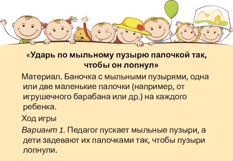 Вариант 1. Педагог пускает мыльные пузыри, а дети задевают их палочками так, чтобы пузыри лопнули.