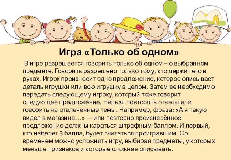 разрешается говорить только об одном – о выбранном предмете. Говорить разрешено только тому, кто держит его в руках. Игрок произносит одно предложение, которое описывает деталь игрушки или всю игрушку в целом. Затем ее необходимо передать следующему игроку, который тоже говорит следующее предложение. Нельзя повторять ответы или говорить на отвлечённые темы. Например, фраза: «А я такую видел в магазине…» — или повторно произнесённое предложение должны караться штрафным баллом. И первый, кто наберет 3 балла, будет считаться проигравшим. Со временем можно усложнять игру, выбирая предметы, у которых меньше признаков и которые сложнее описывать.