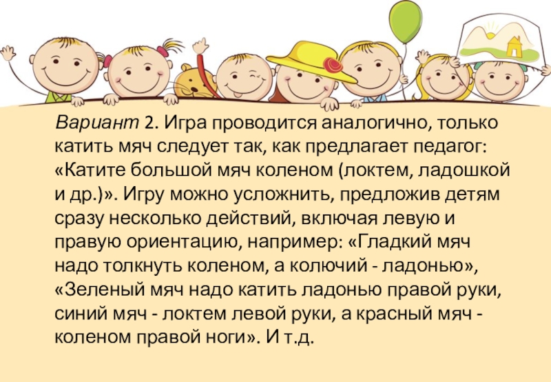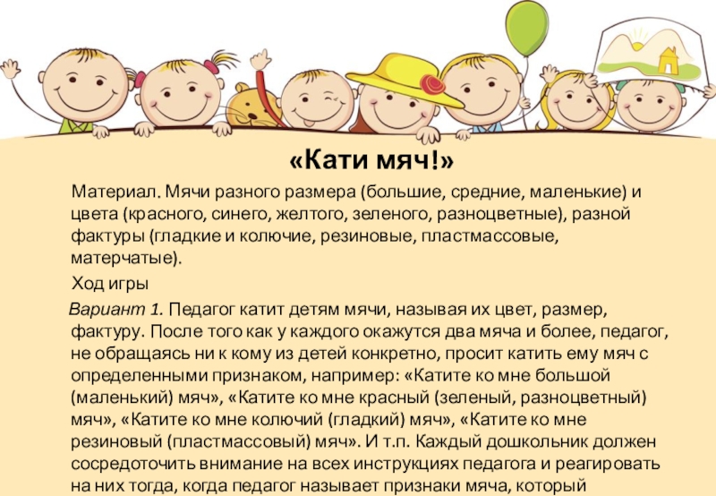Вариант 1. Педагог катит детям мячи, называя их цвет, размер, фактуру. После того как у каждого окажутся два мяча и более, педагог, не обращаясь ни к кому из детей конкретно, просит катить ему мяч с определенными признаком, например: «Катите ко мне большой (маленький) мяч», «Катите ко мне красный (зеленый, разноцветный) мяч», «Катите ко мне колючий (гладкий) мяч», «Катите ко мне резиновый (пластмассовый) мяч». И т.п. Каждый дошкольник должен сосредоточить внимание на всех инструкциях педагога и реагировать на них тогда, когда педагог называет признаки мяча, который находится у него.