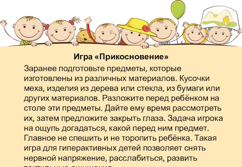 материалов. Кусочки меха, изделия из дерева или стекла, из бумаги или других материалов. Разложите перед ребёнком на столе эти предметы. Дайте ему время рассмотреть их, затем предложите закрыть глаза. Задача игрока на ощупь догадаться, какой перед ним предмет. Главное не спешить и не торопить ребёнка. Такая игра для гиперактивных детей позволяет снять нервной напряжение, расслабиться, развить тактильные ощущения.