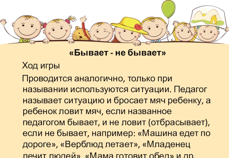 аналогично, только при назывании используются ситуации. Педагог называет ситуацию и бросает мяч ребенку, а ребенок ловит мяч, если названное педагогом бывает, и не ловит (отбрасывает), если не бывает, например: «Машина едет по дороге», «Верблюд летает», «Младенец лечит людей», «Мама готовит обед» и др.