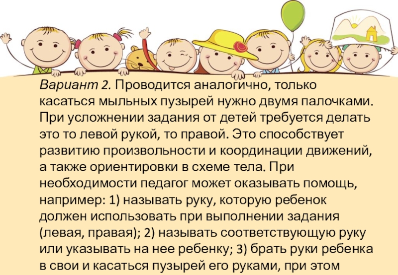 нужно двумя палочками. При усложнении задания от детей требуется делать это то левой рукой, то правой. Это способствует развитию произвольности и координации движений, а также ориентировки в схеме тела. При необходимости педагог может оказывать помощь, например: 1) называть руку, которую ребенок должен использовать при выполнении задания (левая, правая); 2) называть соответствующую руку или указывать на нее ребенку; 3) брать руки ребенка в свои и касаться пузырей его руками, при этом громко называть, какая это рука - левая или правая.