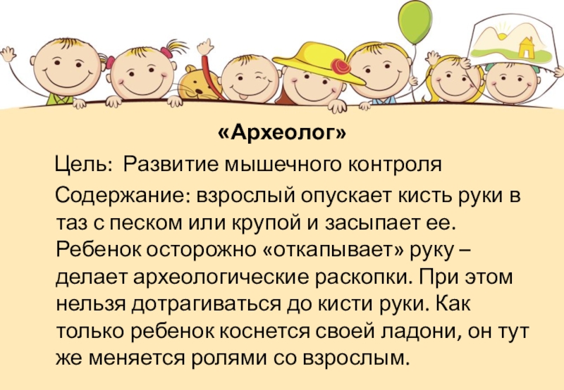 руки в таз с песком или крупой и засыпает ее. Ребенок осторожно «откапывает» руку – делает археологические раскопки. При этом нельзя дотрагиваться до кисти руки. Как только ребенок коснется своей ладони, он тут же меняется ролями со взрослым.