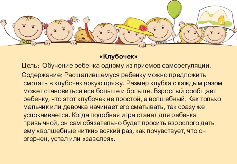 Содержание: Расшалившемуся ребенку можно предложить смотать в клубочек яркую пряжу. Размер клубка с каждым разом может становиться все больше и больше. Взрослый сообщает ребенку, что этот клубочек не простой, а волшебный. Как только мальчик или девочка начинает его сматывать, так сразу же успокаивается. Когда подобная игра станет для ребенка привычной, он сам обязательно будет просить взрослого дать ему «волшебные нитки» всякий раз, как почувствует, что он огорчен, устал или «завелся».