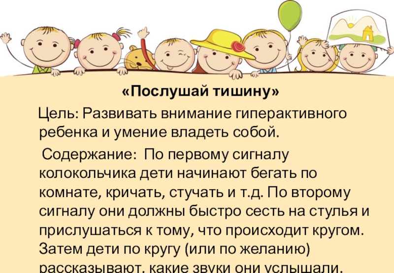 Содержание: По первому сигналу колокольчика дети начинают бегать по комнате, кричать, стучать и т.д. По второму сигналу они должны быстро сесть на стулья и прислушаться к тому, что происходит кругом. Затем дети по кругу (или по желанию) рассказывают, какие звуки они услышали.