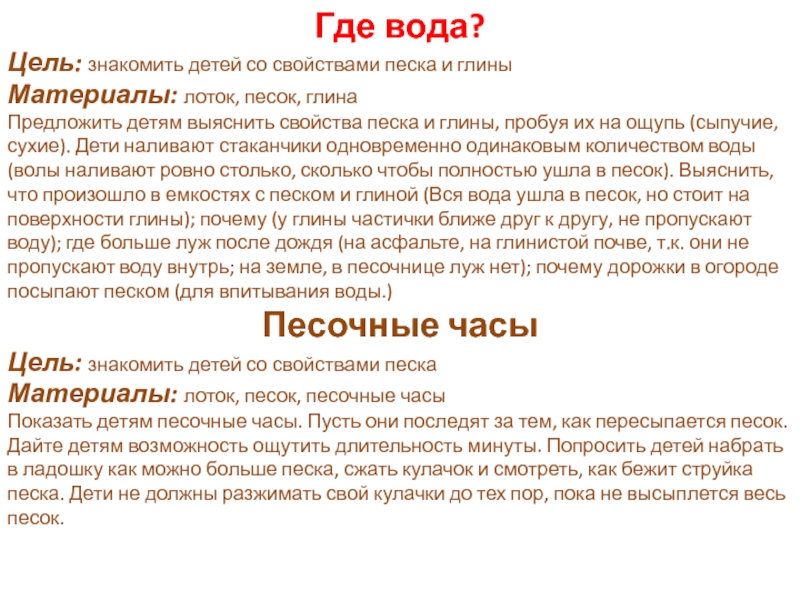 Предложить детям выяснить свойства песка и глины, пробуя их на ощупь (сыпучие, сухие). Дети наливают стаканчики одновременно одинаковым количеством воды (волы наливают ровно столько, сколько чтобы полностью ушла в песок). Выяснить, что произошло в емкостях с песком и глиной (Вся вода ушла в песок, но стоит на поверхности глины); почему (у глины частички ближе друг к другу, не пропускают воду); где больше луж после дождя (на асфальте, на глинистой почве, т.к. они не пропускают воду внутрь; на земле, в песочнице луж нет); почему дорожки в огороде посыпают песком (для впитывания воды.)