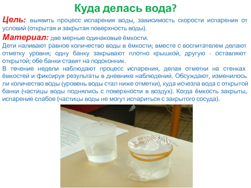 В течение недели наблюдают процесс испарения, делая отметки на стенках ёмкостей и фиксируя результаты в дневнике наблюдений. Обсуждают, изменилось ли количество воды (уровень воды стал ниже отметки), куда исчезла вода с открытой банки (частицы воды поднялись с поверхности в воздух). Когда ёмкость закрыты, испарение слабое (частицы воды не могут испариться с закрытого сосуда).