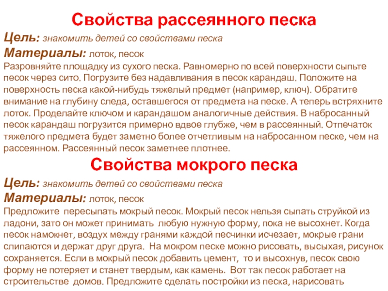 Предложите пересыпать мокрый песок. Мокрый песок нельзя сыпать струйкой из ладони, зато он может принимать любую нужную форму, пока не высохнет. Когда песок намокнет, воздух между гранями каждой песчинки исчезает, мокрые грани слипаются и держат друг друга. На мокром песке можно рисовать, высыхая, рисунок сохраняется. Если в мокрый песок добавить цемент, то и высохнув, песок свою форму не потеряет и станет твердым, как камень. Вот так песок работает на строительстве домов. Предложите сделать постройки из песка, нарисовать картинки на песке.