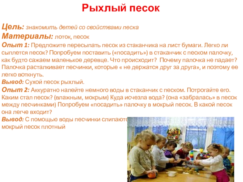 пересыпать песок из стаканчика на лист бумаги. Легко ли сыплется песок? Попробуем поставить («посадить») в стаканчик с песком палочку, как будто сажаем маленькое деревце. Что происходит? Почему палочка не падает? Палочка расталкивает песчинки, которые « не держатся друг за друга», и поэтому ее легко воткнуть.