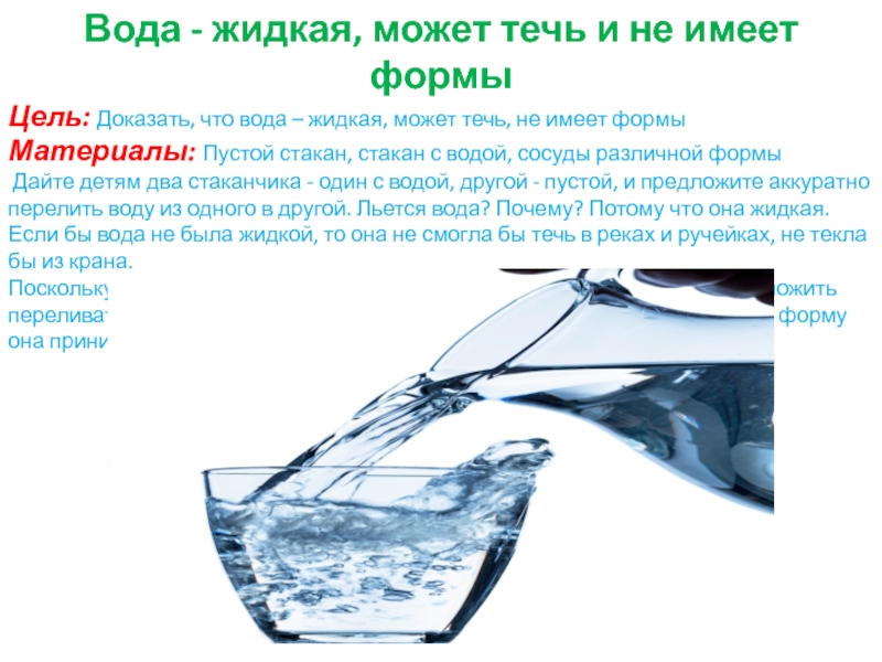 Слайд 7Вода - жидкая, может течь и не имеет формы