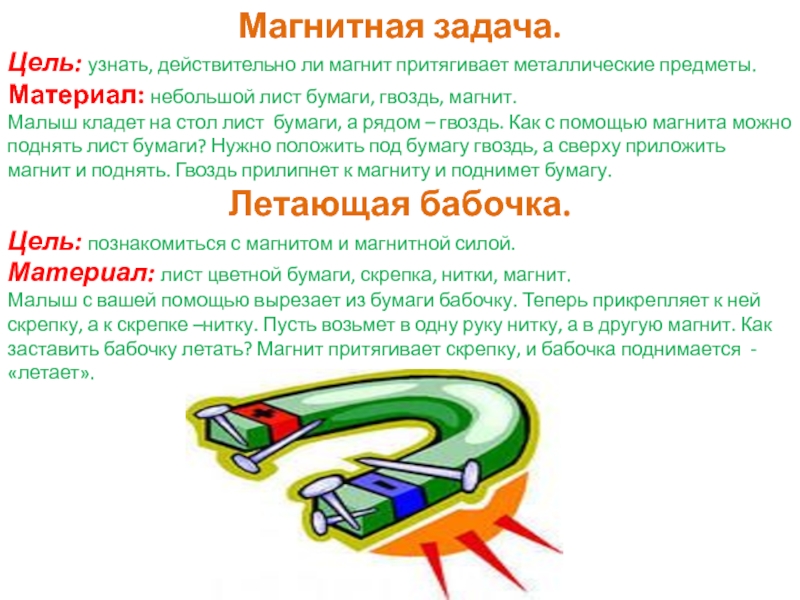 Малыш с вашей помощью вырезает из бумаги бабочку. Теперь прикрепляет к ней скрепку, а к скрепке –нитку. Пусть возьмет в одну руку нитку, а в другую магнит. Как заставить бабочку летать? Магнит притягивает скрепку, и бабочка поднимается - «летает».