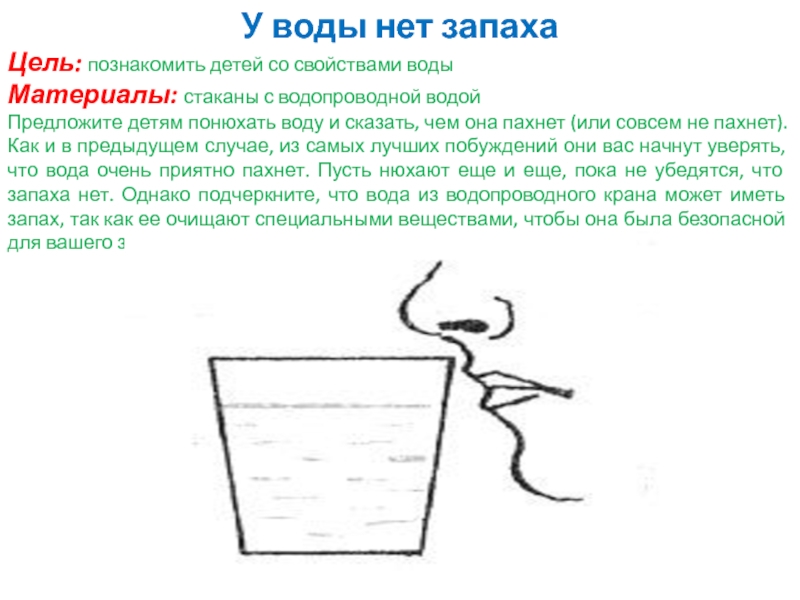Предложите детям понюхать воду и сказать, чем она пахнет (или совсем не пахнет). Как и в предыдущем случае, из самых лучших побуждений они вас начнут уверять, что вода очень приятно пахнет. Пусть нюхают еще и еще, пока не убедятся, что запаха нет. Однако подчеркните, что вода из водопроводного крана может иметь запах, так как ее очищают специальными веществами, чтобы она была безопасной для вашего здоровья.