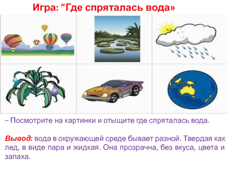 Вывод: вода в окружающей среде бывает разной. Твердая как лед, в виде пара и жидкая. Она прозрачна, без вкуса, цвета и запаха.