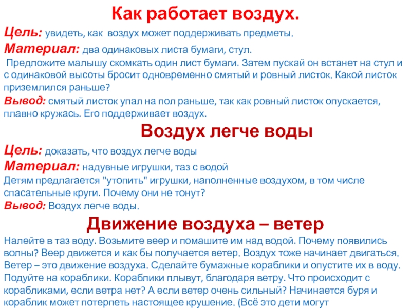 Налейте в таз воду. Возьмите веер и помашите им над водой. Почему появились волны? Веер движется и как бы получается ветер. Воздух тоже начинает двигаться. Ветер – это движение воздуха. Сделайте бумажные кораблики и опустите их в воду. Подуйте на кораблики. Кораблики плывут, благодаря ветру. Что происходит с корабликами, если ветра нет? А если ветер очень сильный? Начинается буря и кораблик может потерпеть настоящее крушение. (Всё это дети могут продемонстрировать).