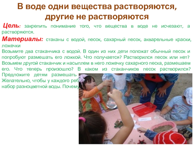 Возьмите два стаканчика с водой. В один из них дети положат обычный песок и попробуют размешать его ложкой. Что получается? Растворился песок или нет? Возьмем другой стаканчик и насыплем в него ложечку сахарного песка, размешаем его. Что теперь произошло? В каком из стаканчиков песок растворился? Предложите детям размешать акварельную краску в стаканчике с водой. Желательно, чтобы у каждого ребенка была своя краска, тогда вы получите целый набор разноцветной воды. Почему вода стала цветной? Краска в ней растворилась.