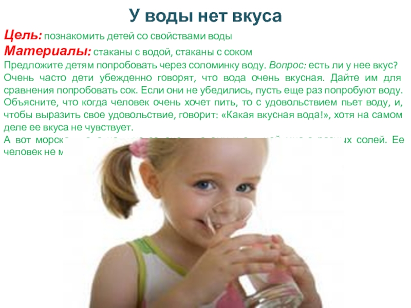 Предложите детям попробовать через соломинку воду. Вопрос: есть ли у нее вкус?