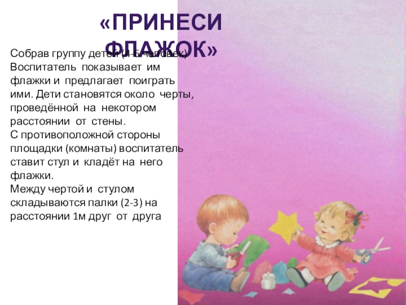 С противоположной стороны площадки (комнаты) воспитатель ставит стул и кладёт на него флажки.