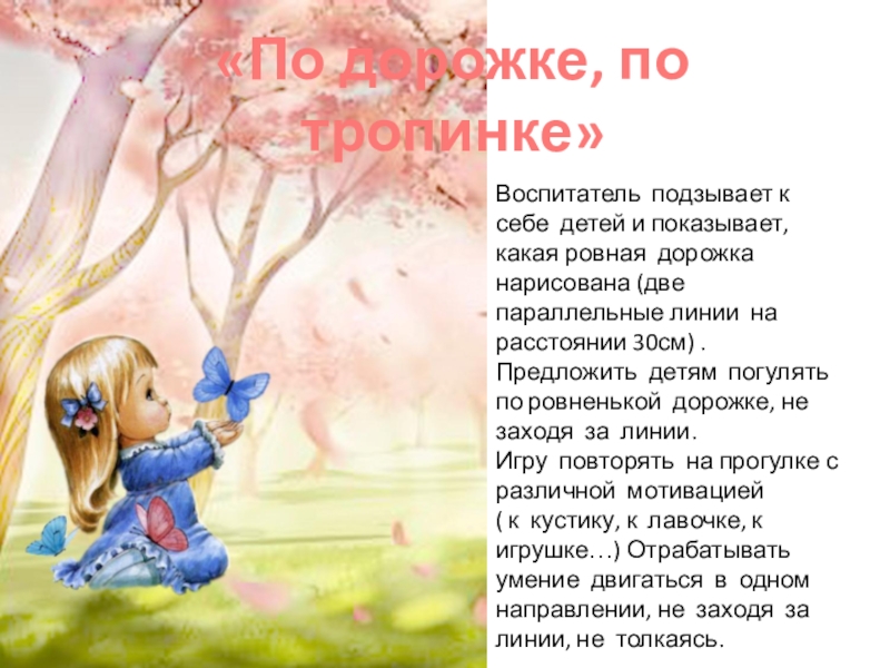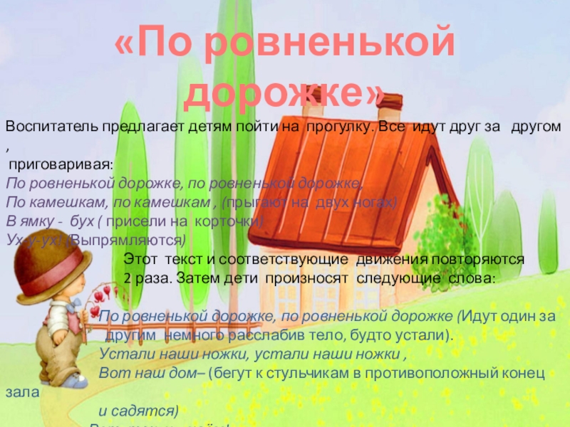 Воспитатель подзывает к себе детей и показывает, какая ровная дорожка нарисована (две параллельные линии на расстоянии 30см) . Предложить детям погулять по ровненькой дорожке, не заходя за линии.