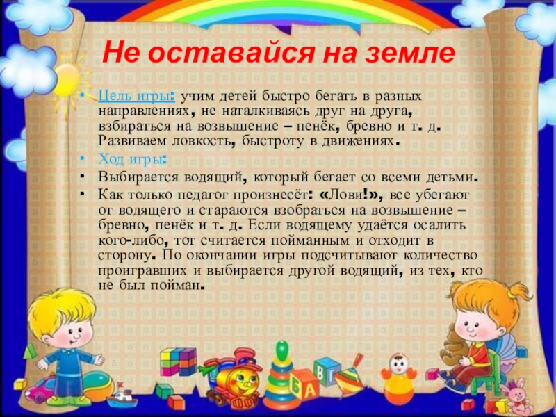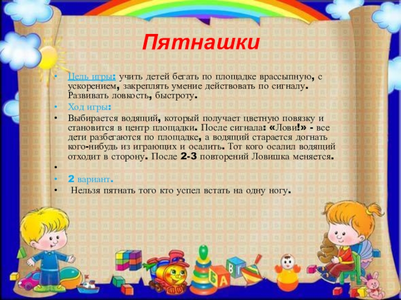 Цель игры: учить детей бегать по площадке врассыпную, с ускорением, закреплять