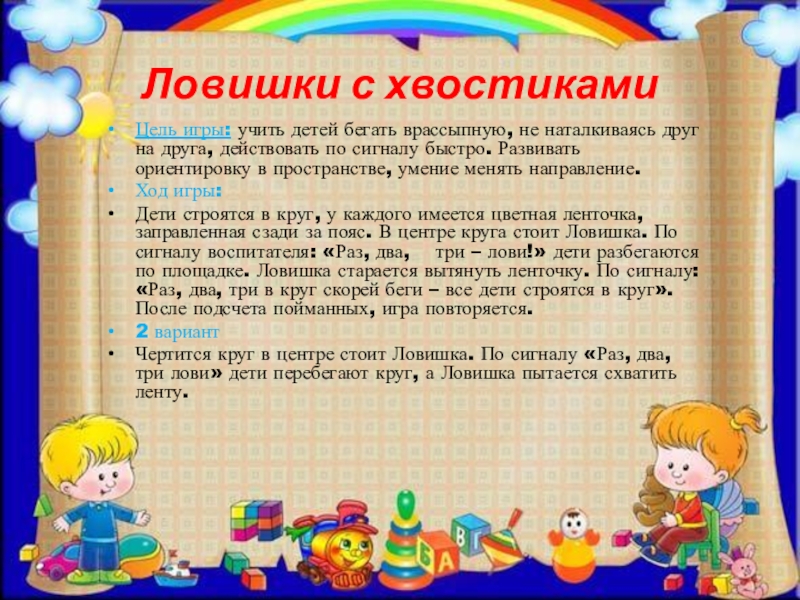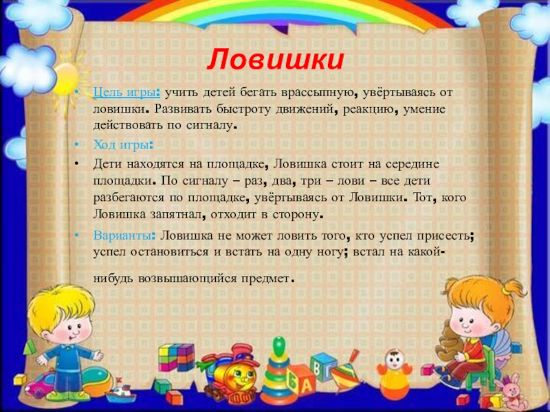 Цель игры: учить детей бегать врассыпную, увёртываясь от ловишки. Развивать быстроту