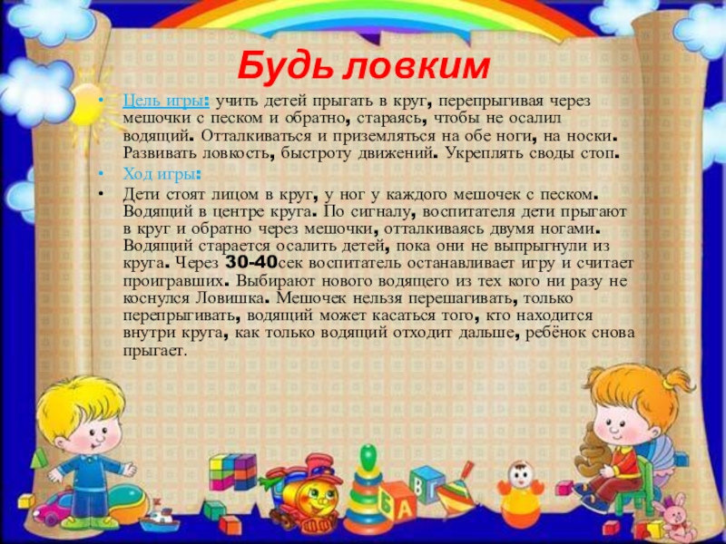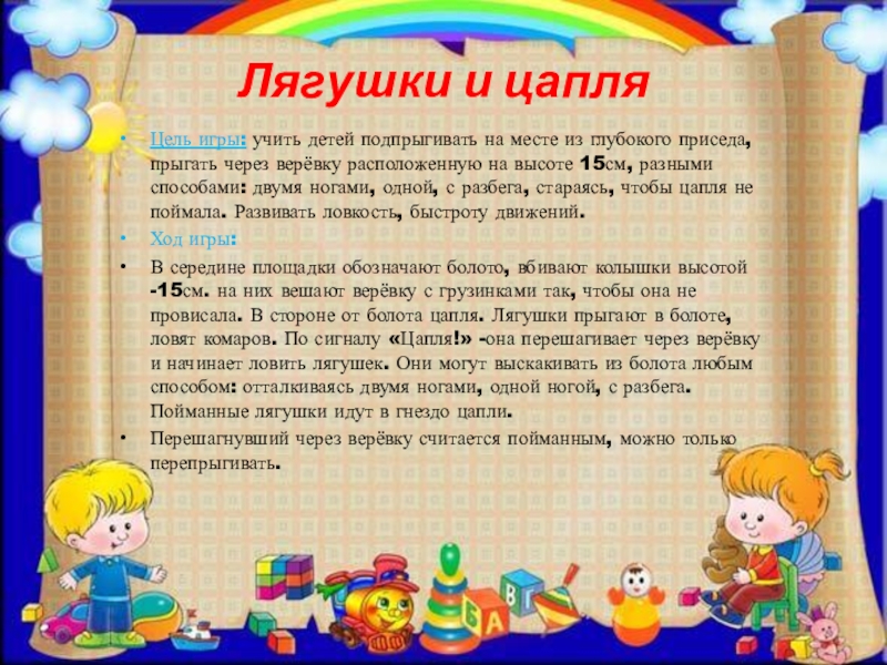Цель игры: учить детей перепрыгивать через верёвку двумя ногами,