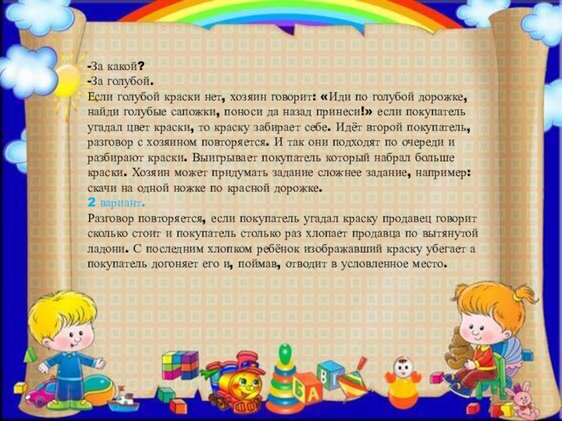 дорожке, найди голубые сапожки, поноси да назад принеси!» если покупатель угадал цвет краски, то краску забирает себе. Идёт второй покупатель, разговор с хозяином повторяется. И так они подходят по очереди и разбирают краски. Выигрывает покупатель который набрал больше краски. Хозяин может придумать задание сложнее задание, например: скачи на одной ножке по красной дорожке.