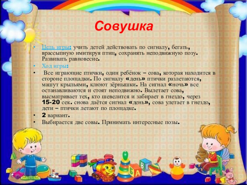 Все играющие птички, один ребёнок – сова, которая находится в стороне площадки. По сигналу «день» птички разлетаются, машут крыльями, клюют зёрнышки. На сигнал «ночь» все останавливаются и стоят неподвижно. Вылетает сова, высматривает тех, кто шевелится и забирает в гнездо, через 15-20 сек. снова даётся сигнал «день», сова улетает в гнездо, дети – птички летают по площадке.