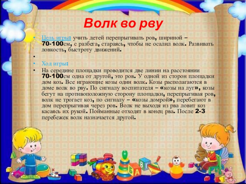 На середине площадки проводится две линии на расстоянии 70-100см одна от другой, это ров. У одной из сторон площадки дом коз. Все играющие козы один волк. Козы располагаются в доме волк во рву. По сигналу воспитателя – «козы на луг», козы бегут на противоположную сторону площадки, перепрыгивая ров, волк не трогает коз, по сигналу – «козы домрой», перебегают в дом перепрыгивая через ров. Волк не выходя из рва ловит коз касаясь их рукой. Пойманные отходят в конец рва. После 2-3 перебежек волк назначается другой.
