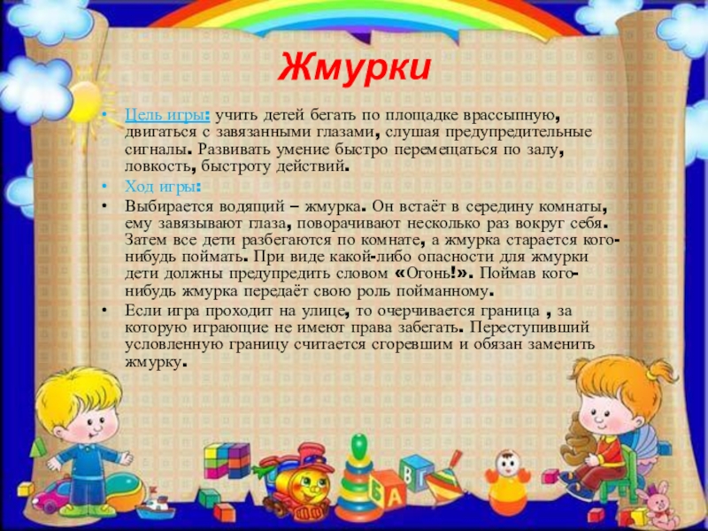Выбирается водящий – жмурка. Он встаёт в середину комнаты, ему завязывают глаза, поворачивают несколько раз вокруг себя. Затем все дети разбегаются по комнате, а жмурка старается кого-нибудь поймать. При виде какой-либо опасности для жмурки дети должны предупредить словом «Огонь!». Поймав кого-нибудь жмурка передаёт свою роль пойманному.