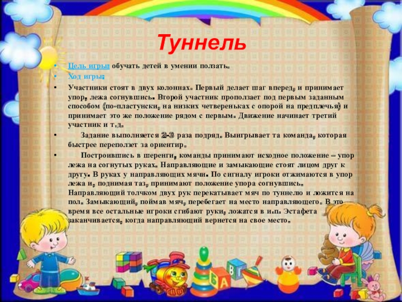 Дети стоят в колонне на расстоянии одного шага от другого. Двое водящих с верёвкой в руках – длина 1,5м, располагаются справа и слева от колонны. По сигналу дети проносят верёвку перед колонной на высоте – 25-30см от земли. Дети в колонне поочерёдно перепрыгивают через верёвку. Затем, миновав колонну, водящие поворачиваются обратно, неся верёвку на высоте 50-60см. дети быстро приседают, принимая положение группировки, чтобы верёвка их не задела. При повторении ведущие меняются.