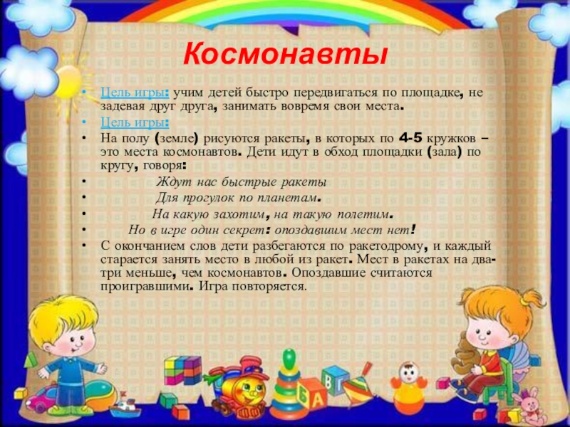 С окончанием слов дети разбегаются по ракетодрому, и каждый старается занять место в любой из ракет. Мест в ракетах на два-три меньше, чем космонавтов. Опоздавшие считаются проигравшими. Игра повторяется.