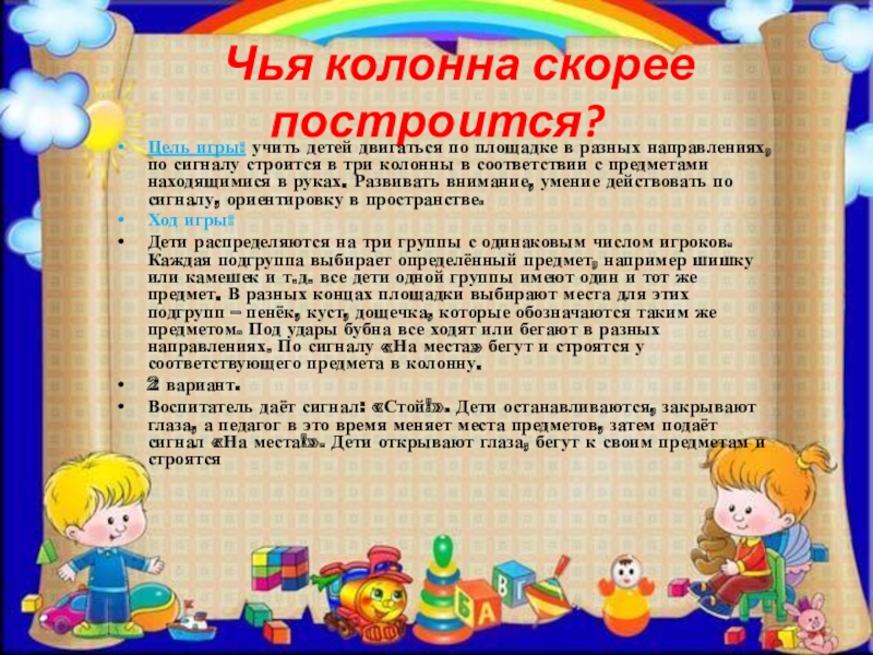 Воспитатель даёт сигнал: «Стой!». Дети останавливаются, закрывают глаза, а педагог в это время меняет места предметов, затем подаёт сигнал «На места!». Дети открывают глаза, бегут к своим предметам и строятся