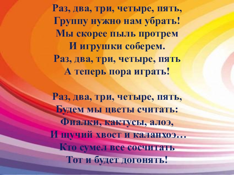 Слайд 9Раз, два, три, четыре, пять, Группу нужно нам убрать! Мы скорее пыль протрем И