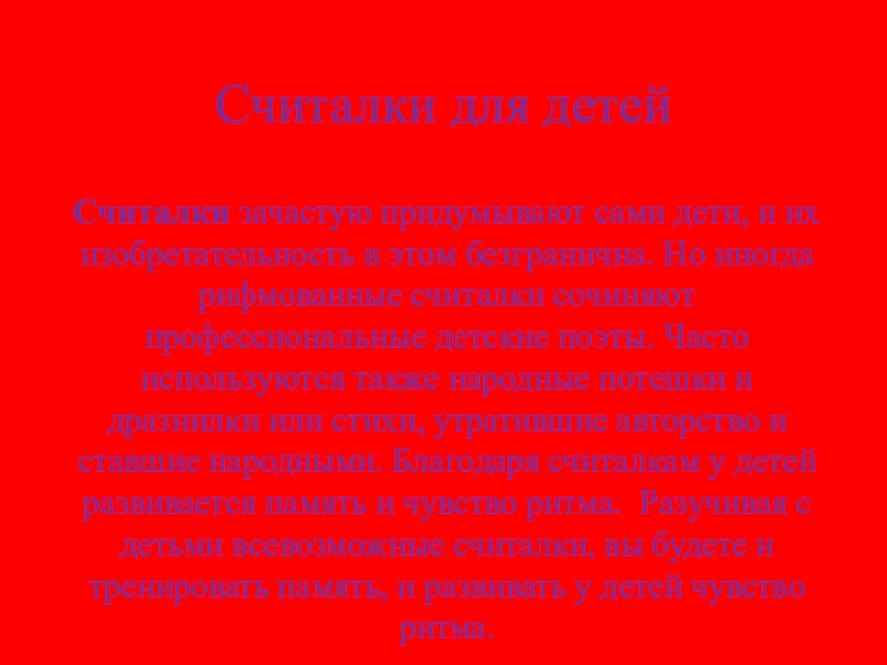 безгранична. Но иногда рифмованные считалки сочиняют профессиональные детские поэты. Часто используются также народные потешки и дразнилки или стихи, утратившие авторство и ставшие народными. Благодаря считалкам у детей развивается память и чувство ритма.  Разучивая с детьми всевозможные считалки, вы будете и тренировать память, и развивать у детей чувство ритма.