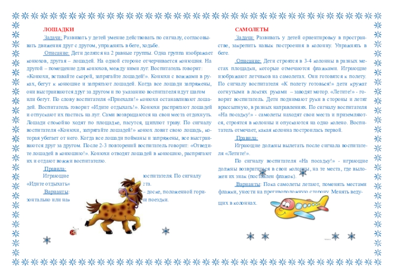 Описание: Дети строятся в 3-4 колонны в разных ме- стах площадки, которые отмечаются флажками. Играющие изображают летчиков на самолетах. Они готовятся к полету. По сигналу воспитателя «К полету готовься!» дети кружат согнутыми в локтях руками – заводят мотор. «Летите!» - го-