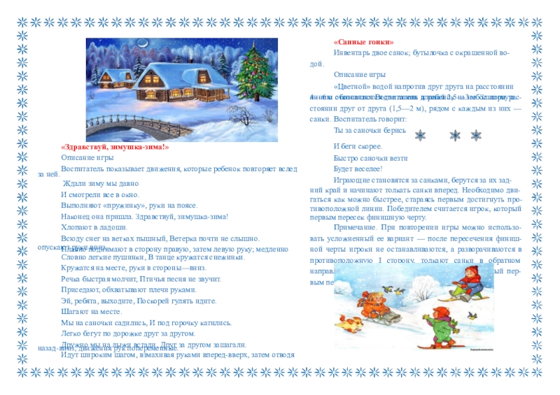 линию становятся Воспитатель и ребенок на небольшом рас- стоянии друг от друга (1,5—2 м), рядом с каждым из них — санки. Воспитатель говорит: