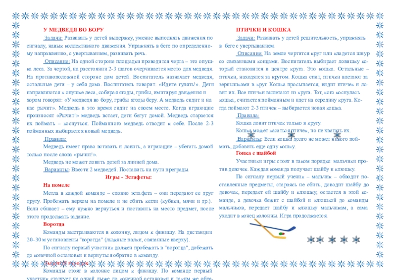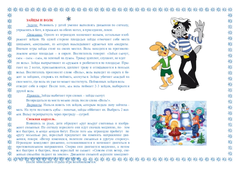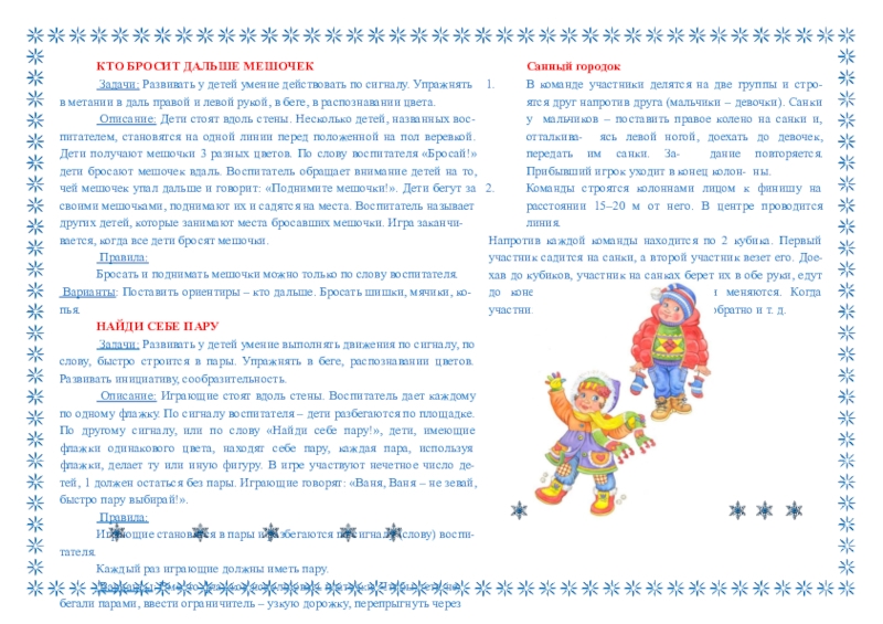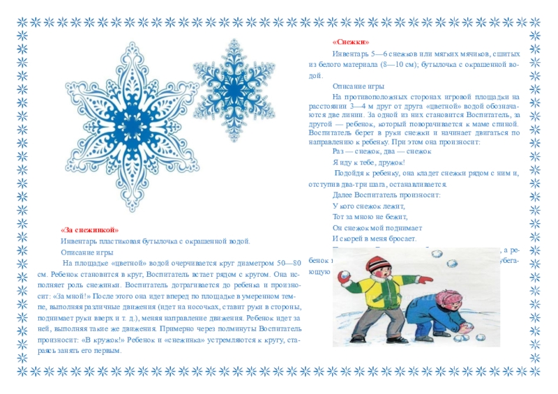 После этого Воспитатель убегает за свою линию, а ре- бенок поворачивается, поднимает снежки и бросает в убега- ющую от него маму, стараясь попасть в нее снежком.
