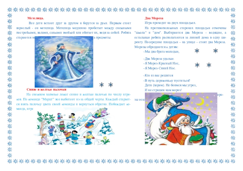 На противоположных сторонах площадки отмечены "школа" и "дом". Выбираются два Мороза – водящие, а остальные ребята располагаются за линией дома в одну ше- ренгу. Посередине площадки – на улице – стоят два Мороза. Морозы обращаются к детям: