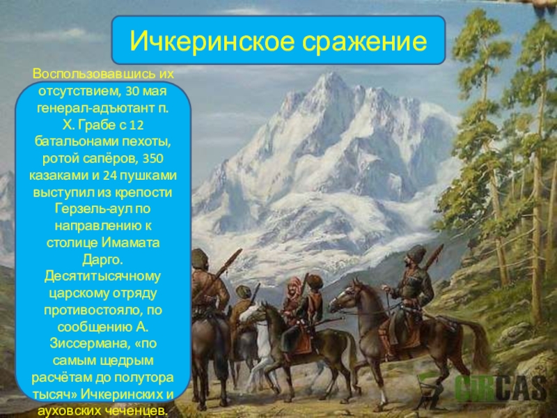12 батальонами пехоты, ротой сапёров, 350 казаками и 24 пушками выступил из крепости Герзель-аул по направлению к столице Имамата Дарго. Десятитысячному царскому отряду противостояло, по сообщению А. Зиссермана, «по самым щедрым расчётам до полутора тысяч» Ичкеринских и ауховских чеченцев.
