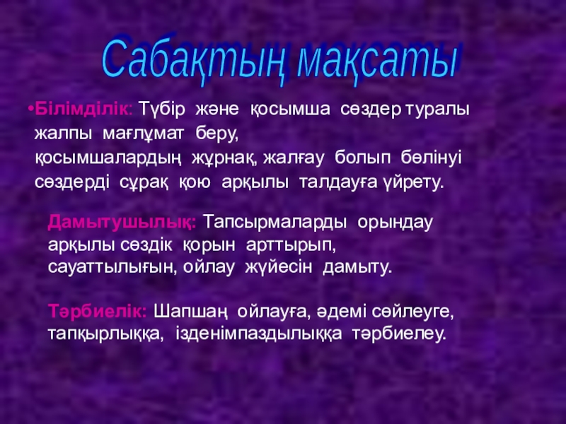 Дамытушылық: Тапсырмаларды орындау арқылы сөздік қорын арттырып, сауаттылығын, ойлау жүйесін дамыту.
