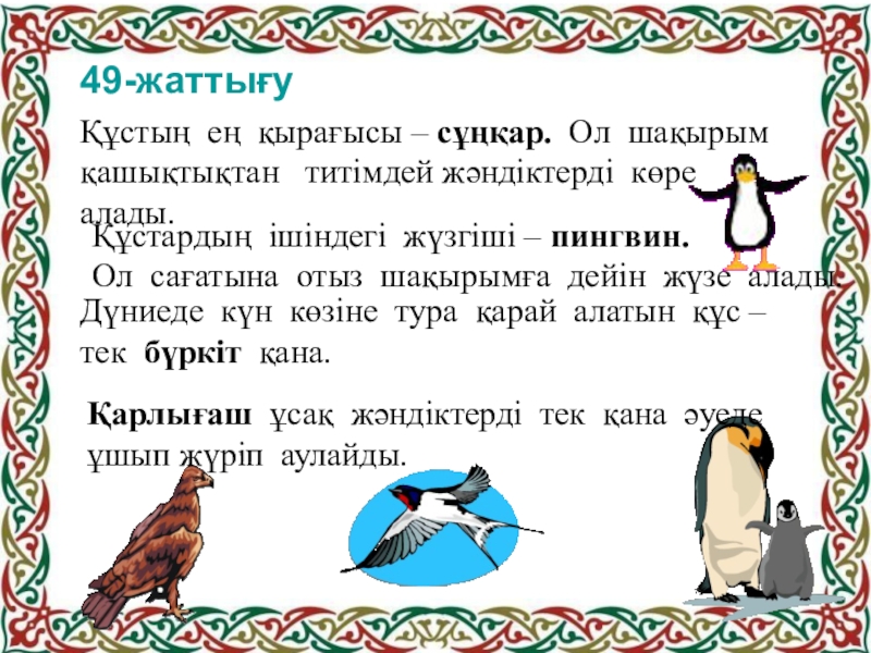 Құстардың ішіндегі жүзгіші – пингвин.
