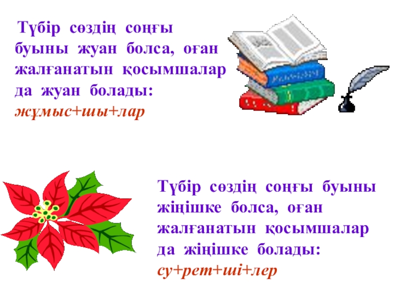 Түбір сөздің соңғы буыны жіңішке болса, оған жалғанатын қосымшалар да жіңішке болады: су+рет+ші+лер