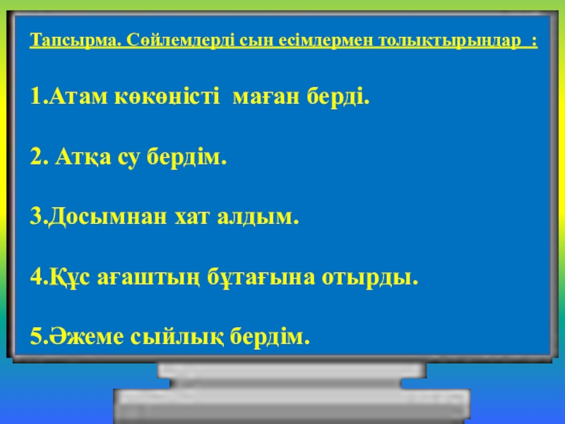 .Тапсырма. Сөйлемдерді сын есімдермен толықтырыңдар :1.Атам көкөністі маған берді.2. Атқа су бердім.3.Досымнан хат алдым.4.Құс ағаштың бұтағына отырды.5.Әжеме