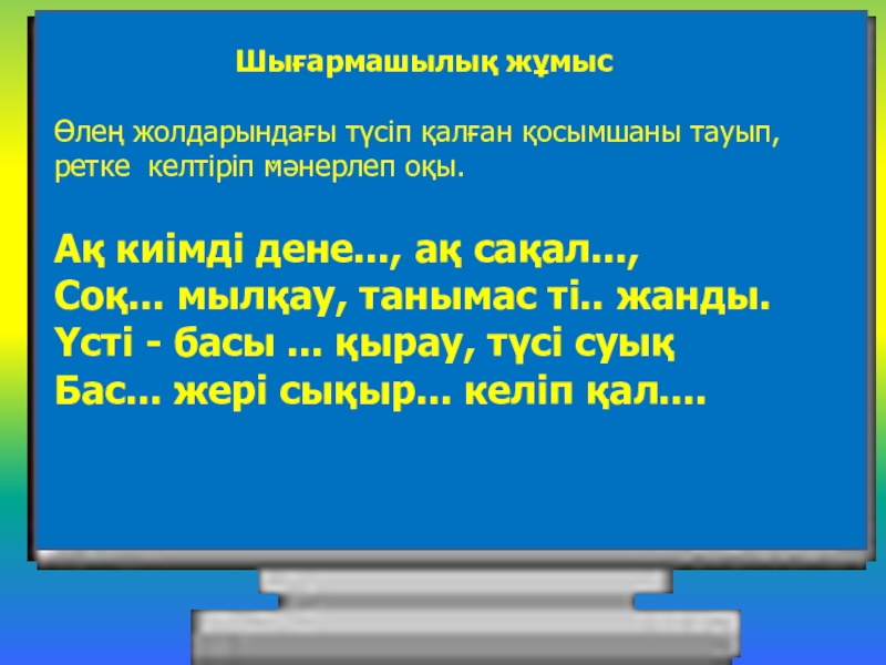 .           Шығармашылық жұмысӨлең жолдарындағы түсіп қалған қосымшаны