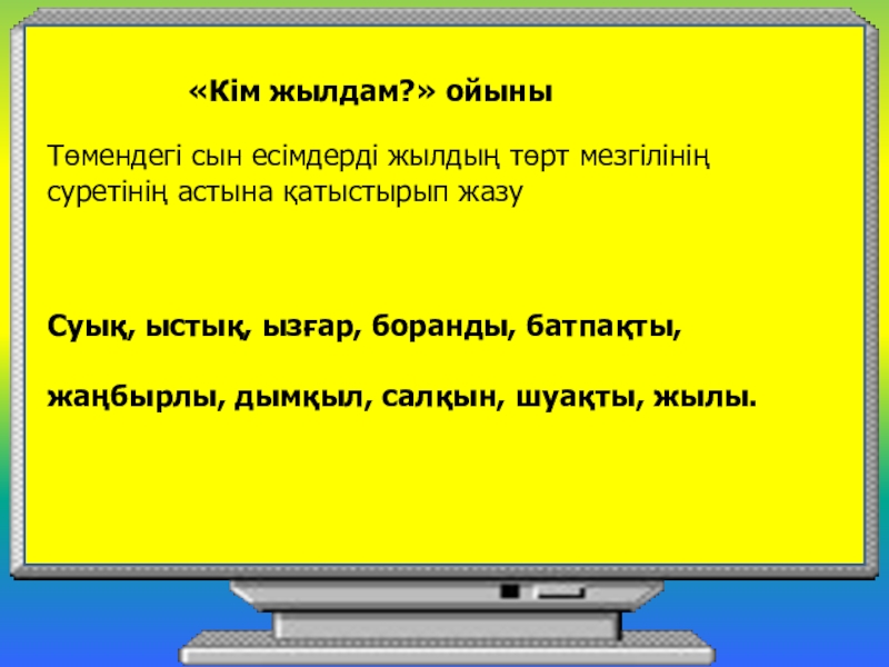Тапсырма: сөйлемдерге сын есімдерді қатыстырыңдар : «Кім жылдам?» ойыныТөмендегі сын есімдерді жылдың төрт мезгілінің суретінің астына қатыстырып жазуСуық, ыстық, ызғар, боранды, батпақты, жаңбырлы, дымқыл, салқын, шуақты,