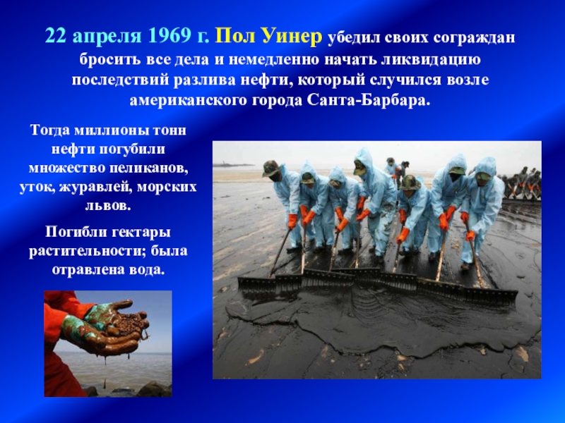 Тогда миллионы тонн нефти погубили множество пеликанов, уток, журавлей, морских львов.