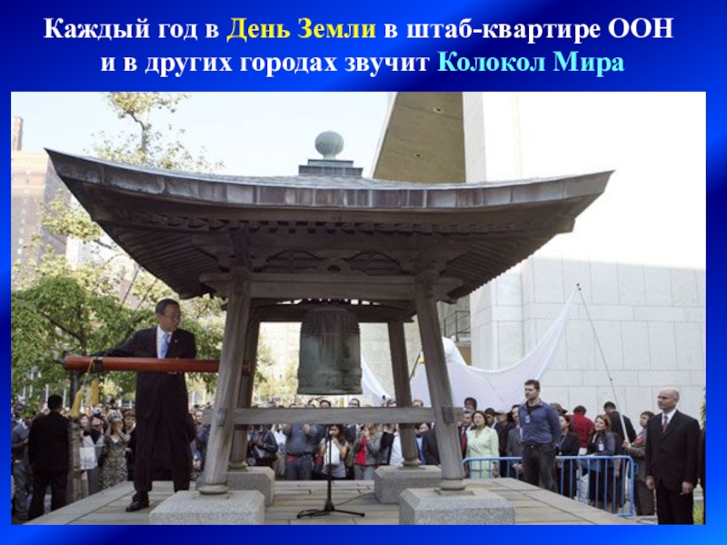 Первый Колокол Мира был установлен в июне 1954 года в штаб-квартире ООН, в японском дворике. Он был отлит в Японии из монет, собранных детьми из 60 стран. Надпись на Колоколе гласит: